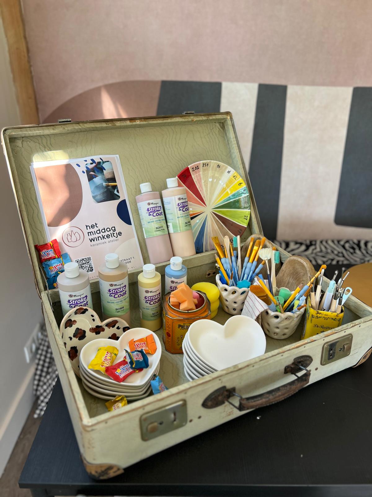Zin in een creatieve middag vol kleur, zonder gedoe? Met onze koffer 2 go haal je een compleet keramiekatelier in huis – mobiel, makkelijk en zó leuk!